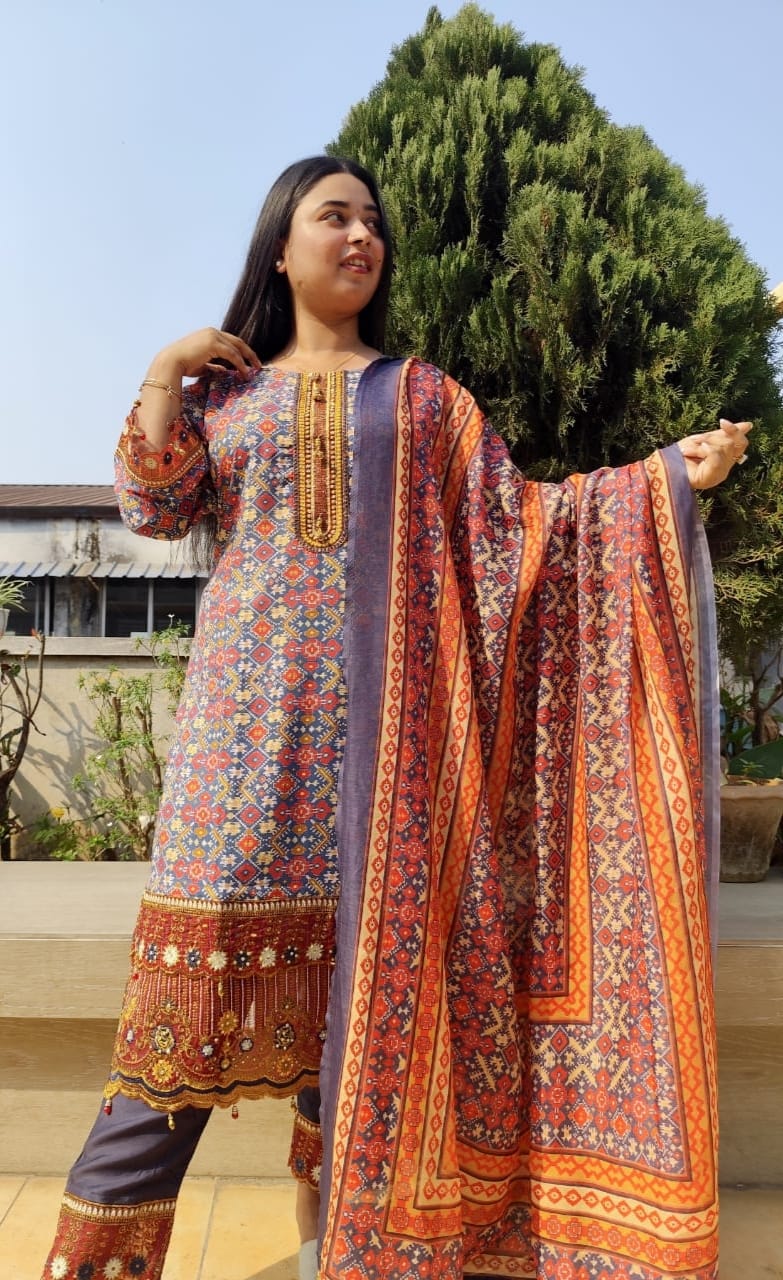 Multicolour Digital printed salwar kameez by Standard Three Piece. It has a cotton kameez with beautiful print design. The dress also includes a cotton Salwar and a cotton Orna that has a matching colour combination. The product is made of high-quality fabrics. Women can wear this in different programs and occasions as per their choices.